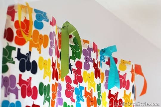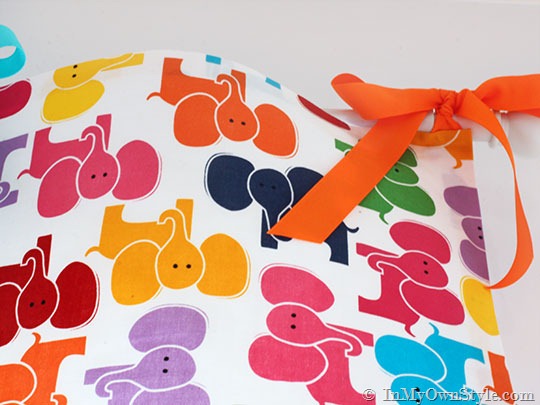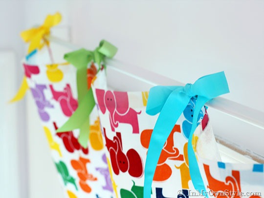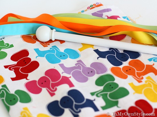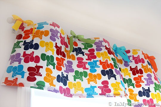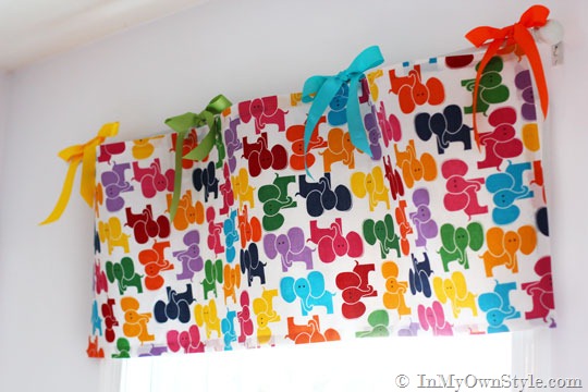 To help demonstrate how simple a tie-on valance is to make – I made a second version without gathers. I found fun novelty fabric at JoAnn’s Fabrics called Multi Colored Elephants by AAK D# 70104. It took me about 30 minutes to make, start to finish.