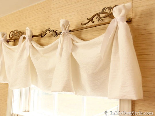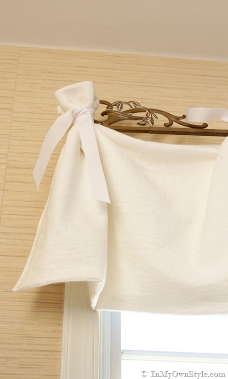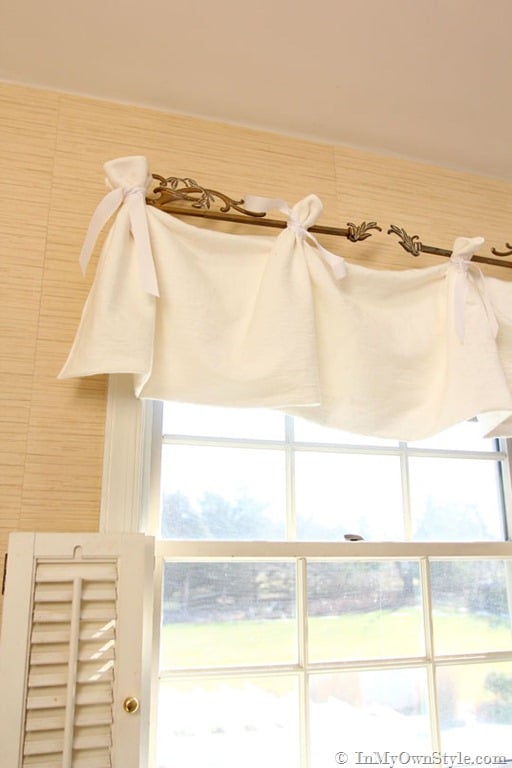 The valance in my master bath is a white rectangle of fabric that is tied onto vintage swing rods with ribbon.