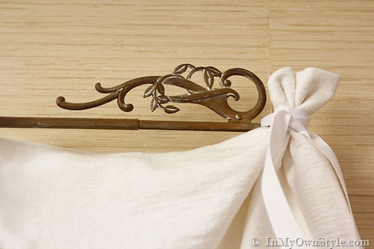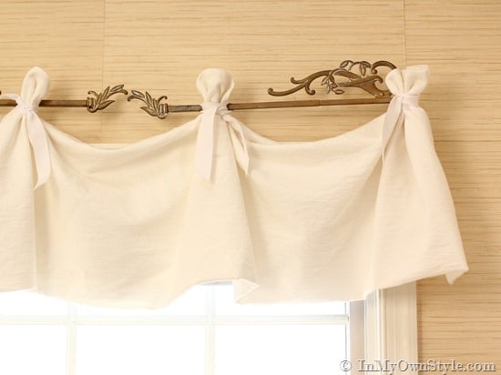 Tie the valance onto the rod making bows with the ribbon. Arrange the fabric so it bows out a bit in between each tie.
