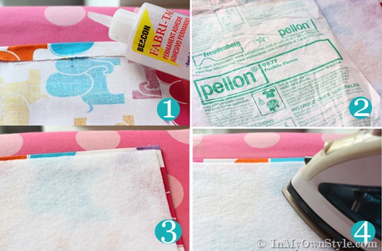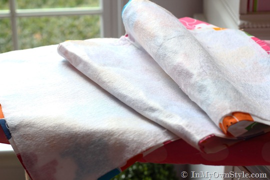 The front is fabric I finished by folding over and pressing raw edges. For the lining, I used iron-on fleece/felt pressed onto the back.