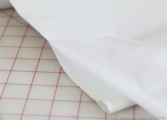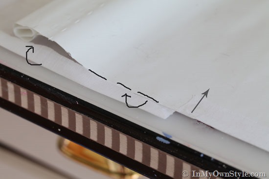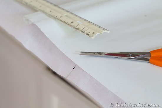 7. Measure 5-inches up from the hem of the shade. Make a cut in the fabric that is to be turned to the back at this 5-inch mark. Repeat on the other side of the shade.