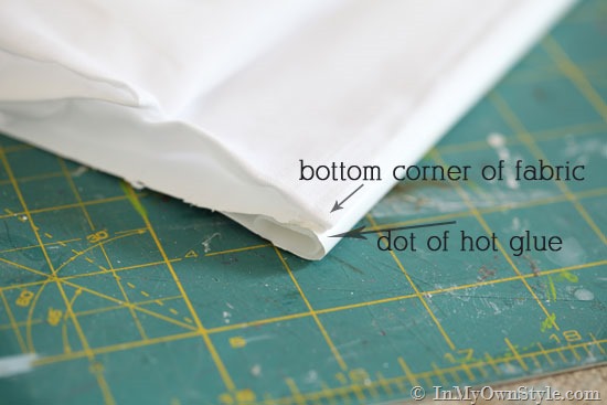 9. Attach the bottom corner of the fabric that falls from the bottom of the shade to the bottom corner of the shade. Use a dot of hot glue to attach. (Make sure not to touch the tip of the glue gun to the vinyl or it will melt it.)