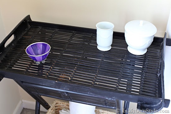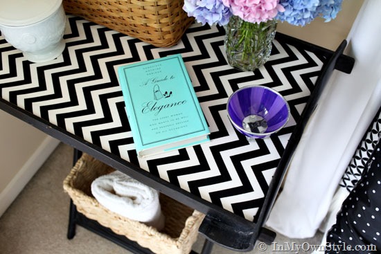 Since I only used a small section from the yard of fabric, I decided to also make a tray insert in the same way I made the memo board, but instead of hanging it, I placed it flat into this tray table in my guest room.