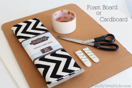 To make the kitchen cabinet message board I needed a piece of foam board from the dollar store and fabric. You could also use corrugated cardboard cut from a large box.