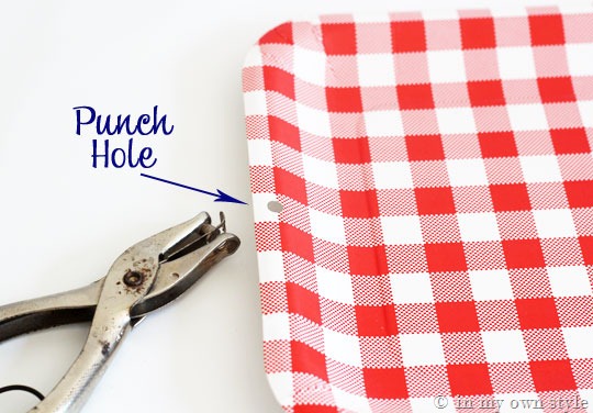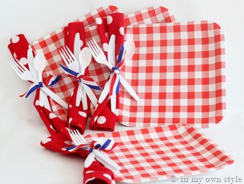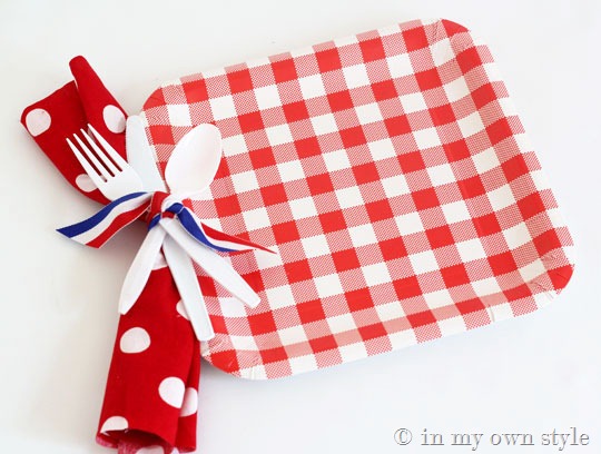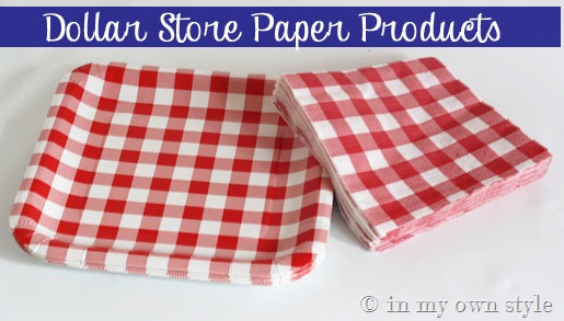 I found the gingham plates and napkins at The Dollar Tree. I decided to add a bit of contrast and use red and white polka dot napkins with the plates instead of all gingham.