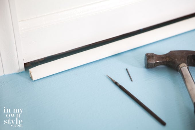 I used finishing nails and a nail punch to counter sink the nails to attach the shoe molding to the baseboard. I filled the nail holes with Spackle and then sanded the areas smooth.