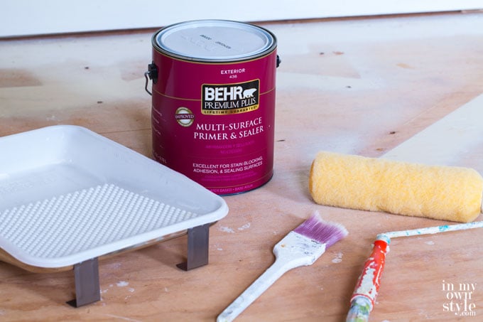 If you want the painted plywood floor to last don’t skip the priming step. I needed 2 gallons of Behr Multi-Surface Primer Sealer to get full coverage and 2 coats.