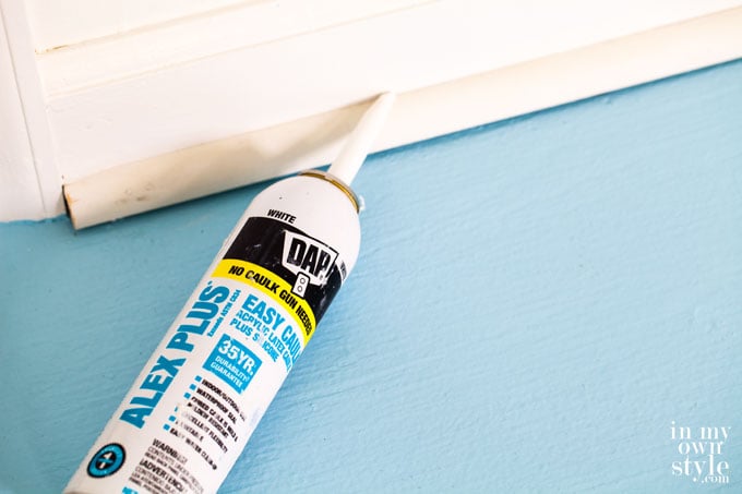 I am no pro when working with molding and always need to use caulk to cover up all my imperfect cuts. I call this brand of caulk – Cheez-Wiz caulk. No caulk gun is needed. It is my favorite caulk to use. I buy it at Walmart.