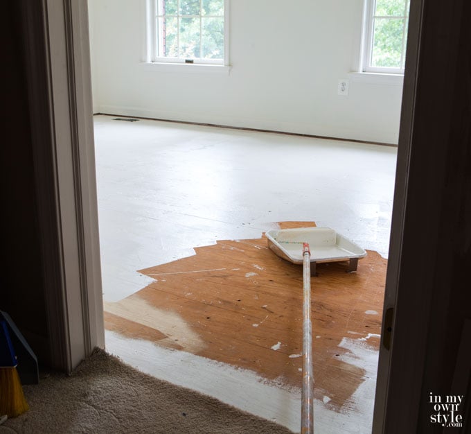 Helpful Tip: The most important thing when painting plywood floors is to work from the farthest corner and then work backwards until you reach the door to exit. If you did it the other way, you would get stuck and have to walk over wet paint to get out the the room.