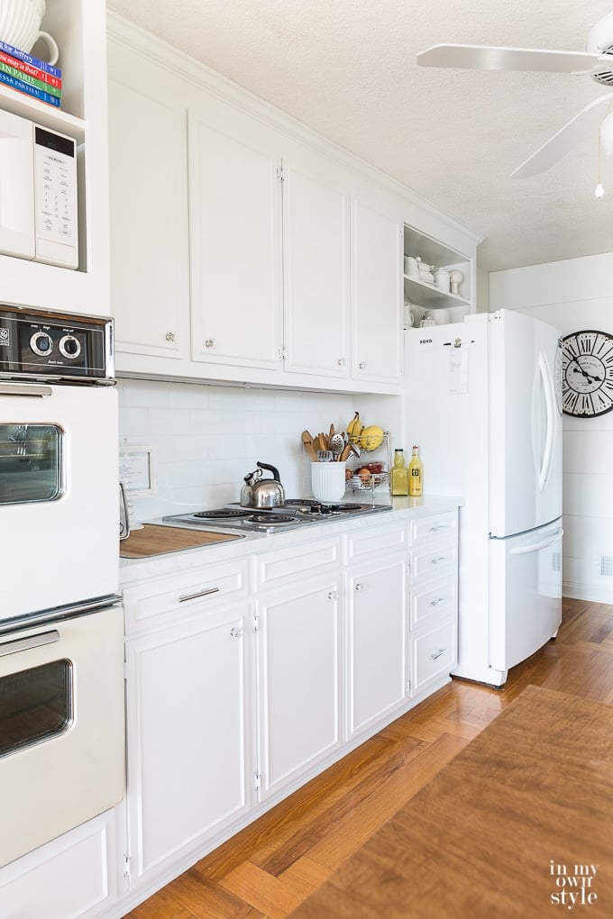 My kitchen used to look like yours did. I put beadboard on walls and ceiling and like you, went to great care when preparing and painting my cabinets. I used Valspar paint and accessorized with black instead of chrome. It is worth every minute of prep and paint time. And your step by step tutorial is perfect. Mine has been complete for a year and I love it as much today as I did the day it was completed. Any spills and spots wipe off easily and my kitchen is so much brighter. Enjoy. Enjoy. You made a beautiful transformation.