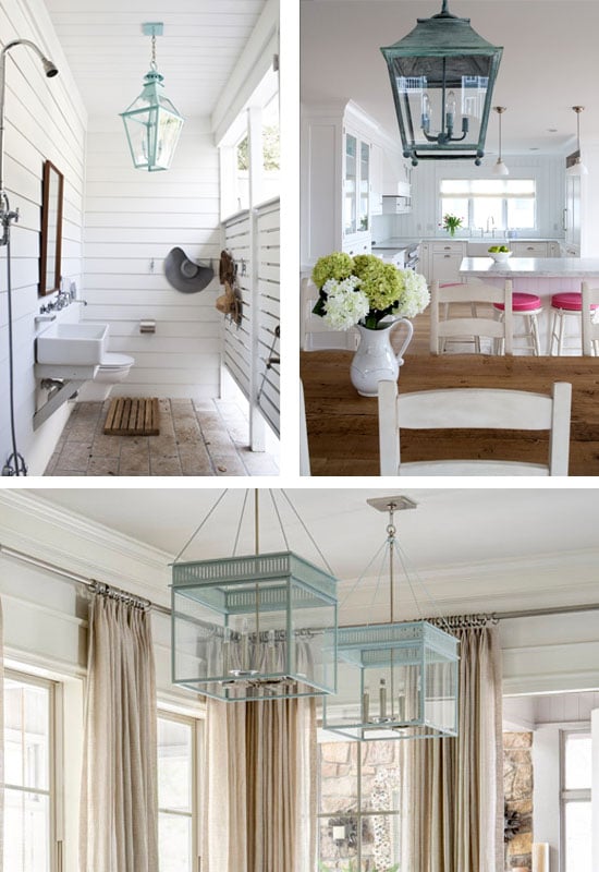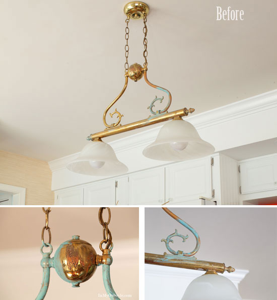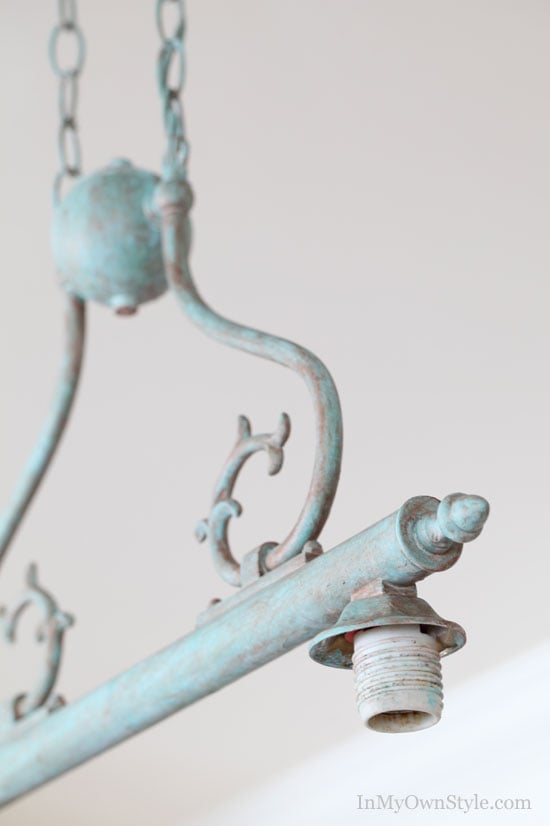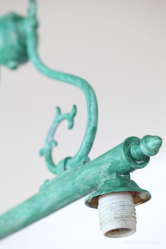 I like the look of unique light fixtures, especially ones with age and character and that have a bit of greenish patina. Do you remember the cheap-o brass builder chandelier I aged with paint a few years ago?