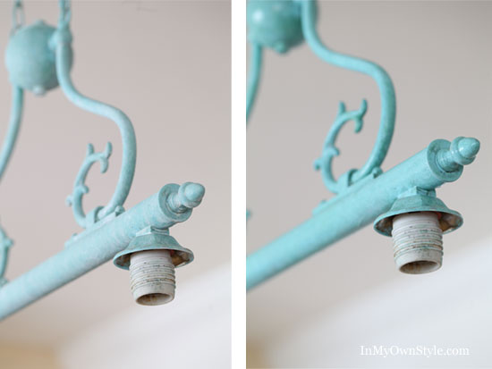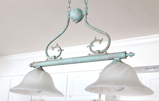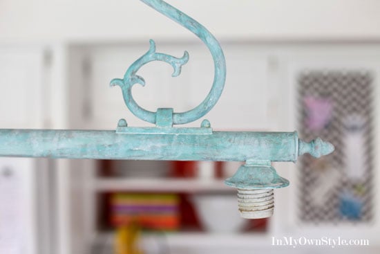 Here is my newly transformed kitchen island light. I did not seal it since I want it to look a bit chalky, just like real verdigris.