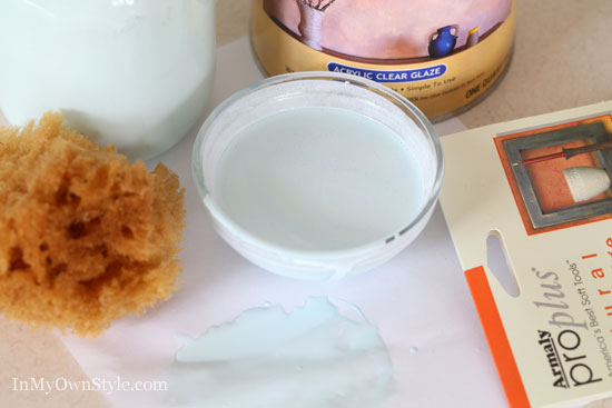 3. In a mixing bowl, mix 1 part light turquoise paint to 3 parts glaze. Mix well. I later transferred this mix to a divided tray so I could hold 2 colors in my hand as I worked.