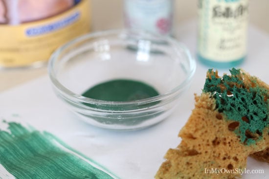 6. Apply the medium turquoise paint and glaze mixture with a sea sponge. Dab it all over, then blot sponge on paper towel and go back to remove some of the paint. Keep doing this until you like what you see.
