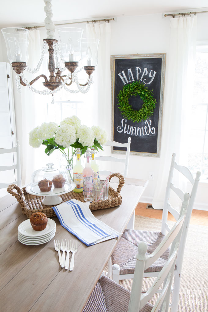 Diane! You did an absolutely beautiful job! Your parents would be so proud. I love the whole look of the dining room., the jute rug, the flowers, the sea grass and white wicker trays. your choice of colors, the chandelier – they all complete that beach cottage vibe that I love. Coastal Living decorators have nothing on you! I am impressed that you can paint in the house without making a mess. It’s very hot and humid here were I live in Baltimore too which has been stopping me from completing a single chair. Think I”ll try your method.
