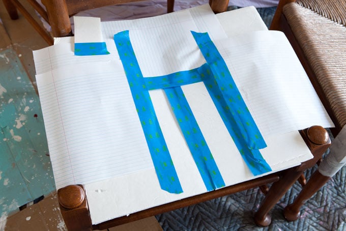 2. I made a paper mask template using scraps of paper and foam board I had laying around to protect the chair seats as I painted the wood sections on the chairs. I only needed one template and moved it from chair to chair as I painted.