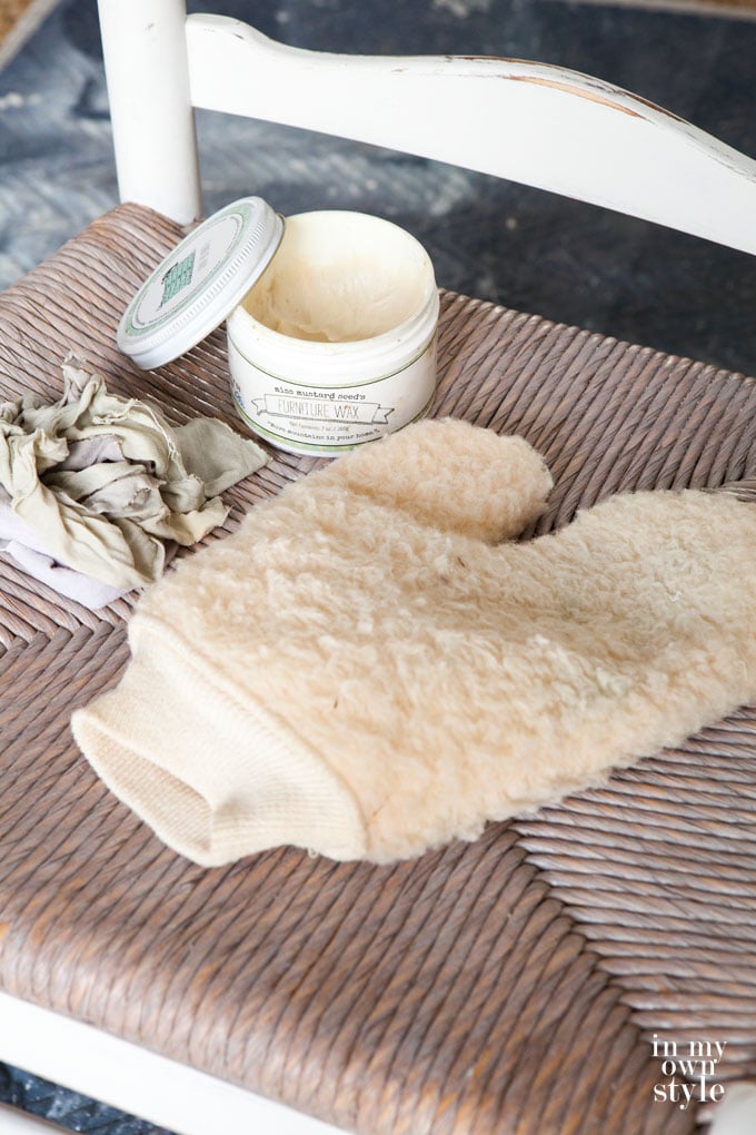 I used a clean cloth to buff the wax to bring up the shine and have found this fleece painting mitt (in photo above) is a very good buffing cloth. It makes buffing fast and easy especially around the legs on the chairs.