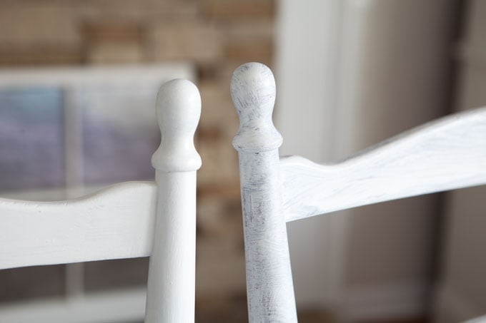 5. Once the paint was dry, I went over the edges of the chairs with 120-grit sandpaper to distress the edges. I tried to hit all the areas where the chair would normally see wear. Once I liked how much distressing there was on each chair, I applied the wax.