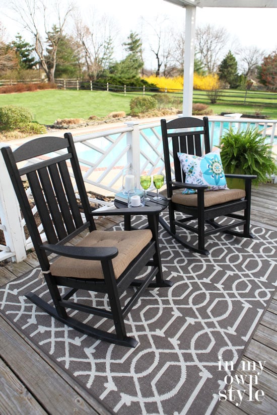 Diane, you have a gorgeous backyard, lucky lady!! The rocking chairs are the icing on the cake, I love your deck and pergola. Gorgeous view, really, even if it is NOT the ocean. I am loving my furniture too!