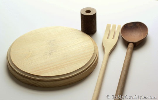 • Wooden spoon and fork with round dowel-like handles