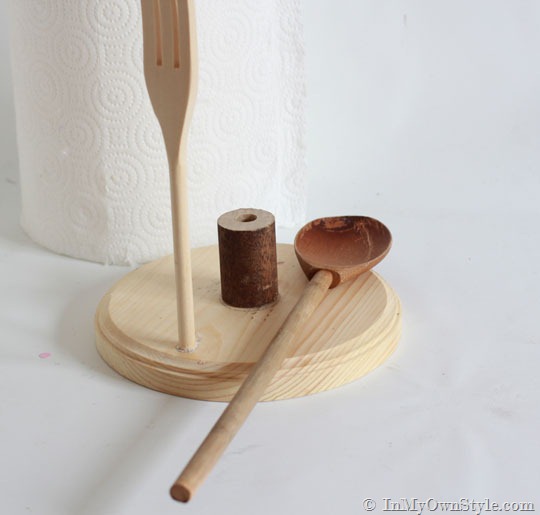 • Optional:  If your wood utensils are not as high as the paper towel roll you use, you will need to add a section of a 1- 1/4” diameter wood dowel to create more height for the center utensil.  I had the dowel in my scrap wood pile, but a wooden thimble would work well, too.