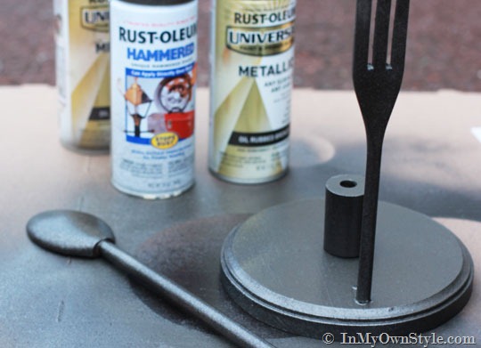 The Pottery Barn paper towel holder is on the left. I didn’t have a fork as decorative or long enough for the center of the holder, so I switched the utensils around to make my Pottery Barn knock off version on the right.