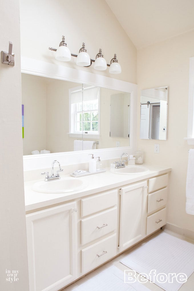 It is an easy project that makes “stock” cabinets look a little bit more stylish. I did this in my kitchen 18 years ago and doing the same in this bath was always on my “to-do” list. Well, I am happy to report that it is finally done!