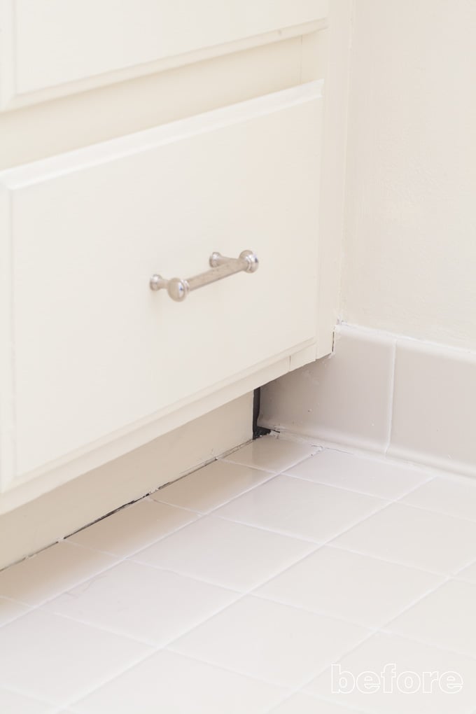 One aspect of the room that always bothered me though was the unfinished area under the sink cabinet. The builder of the house never finished where the toe kickplate and tile floor meet.