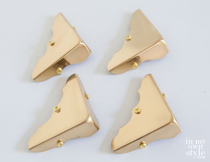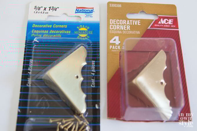 - 4 decorative 5/8″ x 1 3/4″ brass corners – I found them at the hardware store. 4 are included in one package.