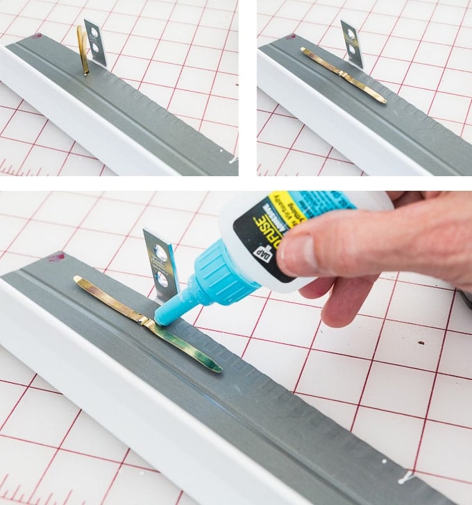 3. Bring tips of brass fastener to inside of drip edge and then spread out to secure. Add a drop of glue over center of opened fastener. Repeat on all other cut sections.