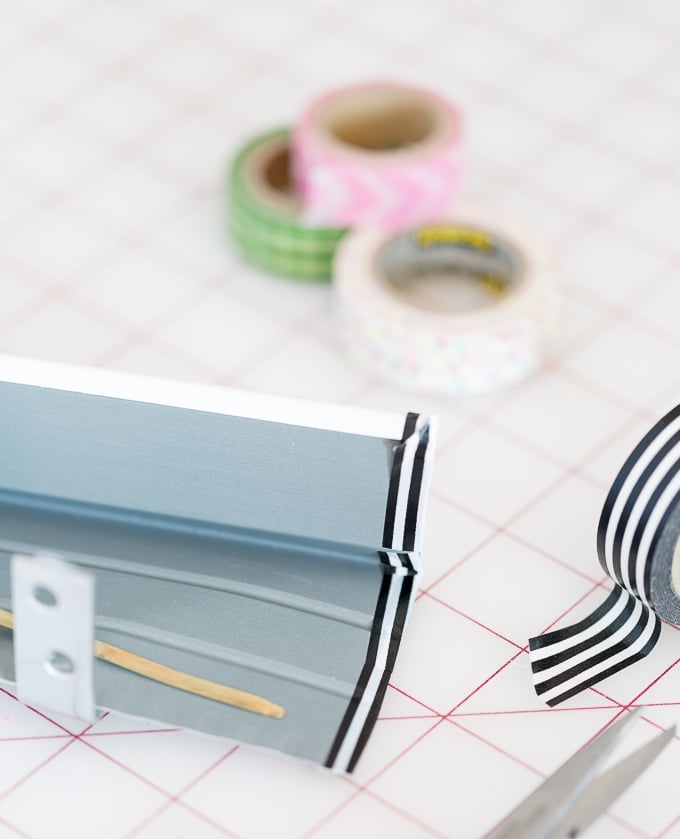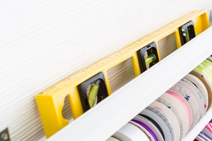 Optional: I left the cut edges of my ribbon organizing shelves alone, but the cut edges can be sharp. If you want to cover the edges, add some colorful Washi tape over each edge before hanging the shelves on the wall.