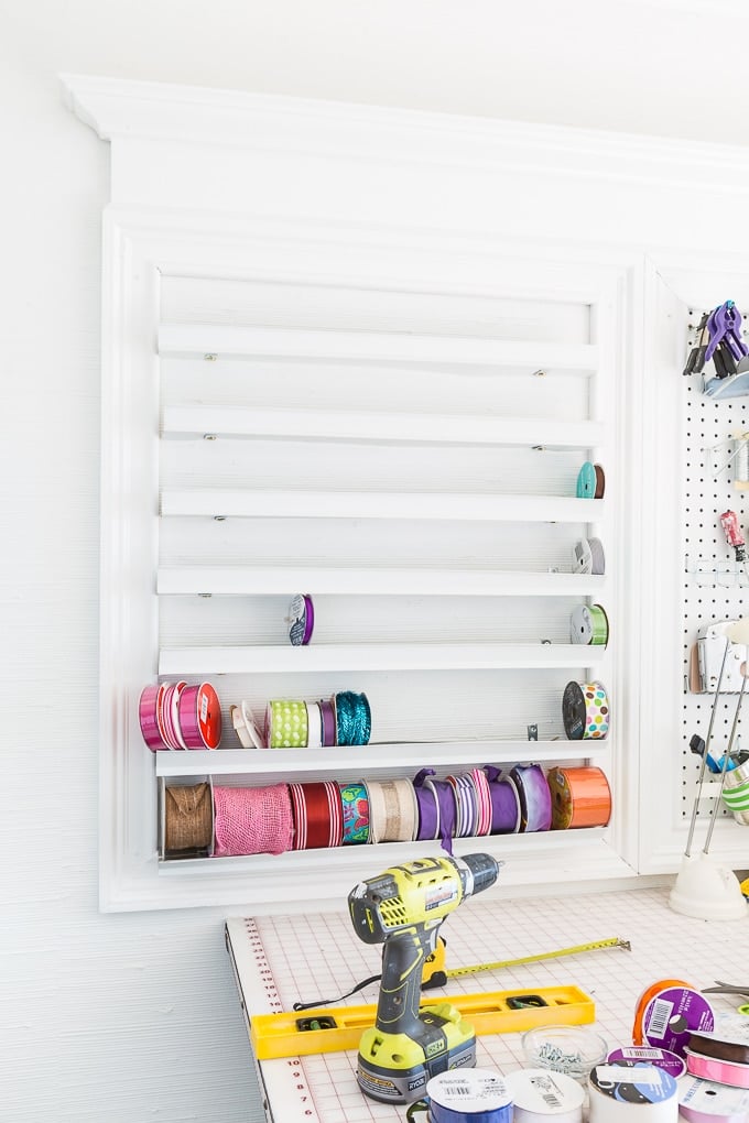 If not, consider turning a closet into a craft closet where you keep your craft supplies. In this closet you can hang a ribbon rack from the closet shelf or create a smaller holder for a smaller collection of ribbons.