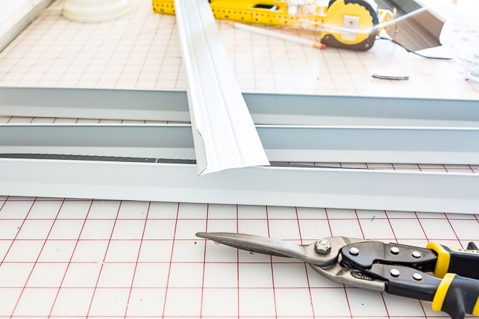 Once the frame is hung on wall (no glass or mat, just the frame), measure the inside width of the frame. This width will be the measurement you will need to cut the aluminum drip edge.