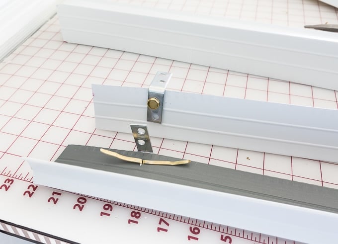 - I cut the aluminum drip edge into 7 pieces to create 7 shelves that fit inside the frame for my ribbon organizer.