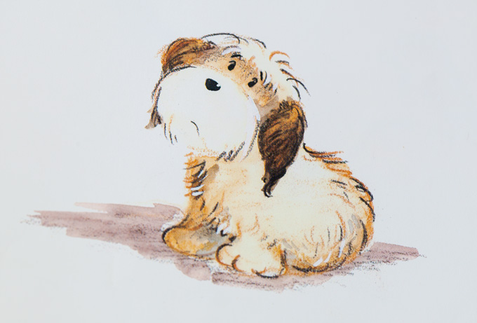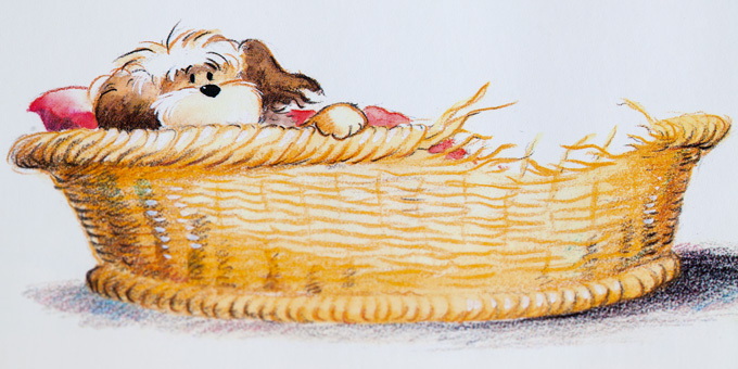 In the story there was a grey cat and a goldfish, the pets we had at the time, all we needed to bring the book to life for us was to get a cute little fluffy brown and white dog.
