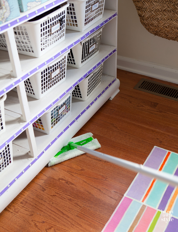 For our home, the kitchen needs the “swiffer treatment” the most. And, we STILL have a cute, little doggy swiffer but he won’t clean up the kitty fur!