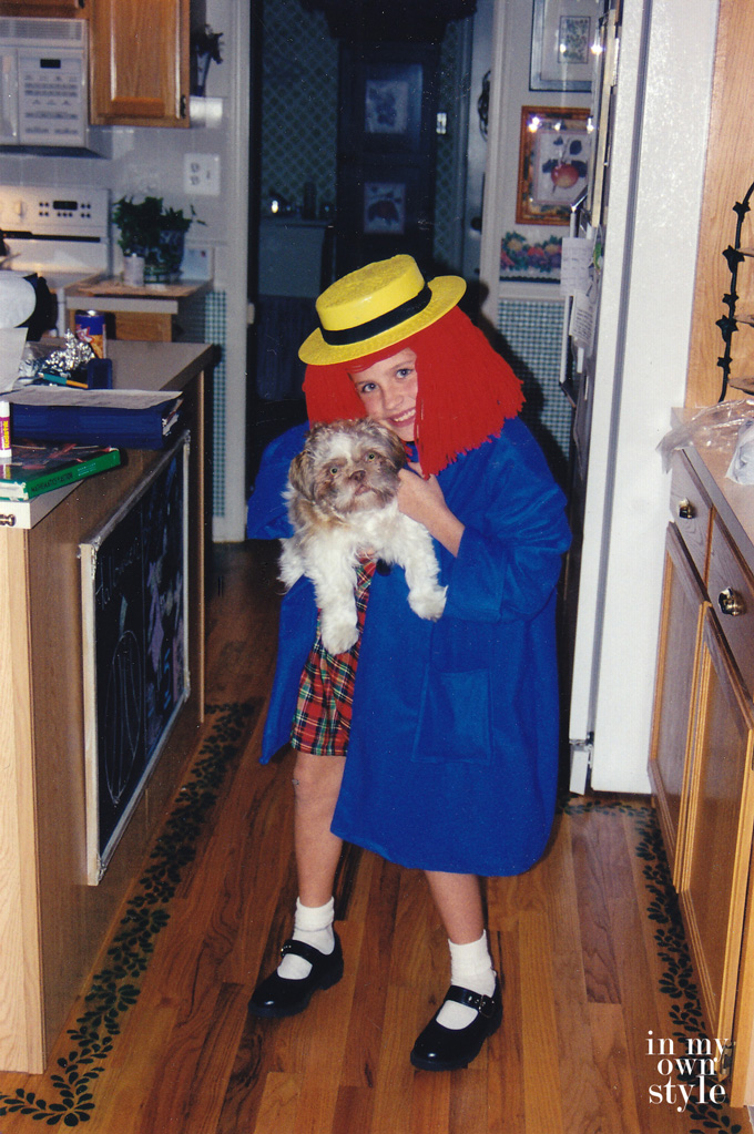 He became a major part of our family. I enjoyed looking through my family photos to find a few of him. It is fun to see how my kitchen looked in the mid 90’s in this photo. I made the Madeline costume for Mandy one Halloween. Schnitzel became a little French dog that night.
