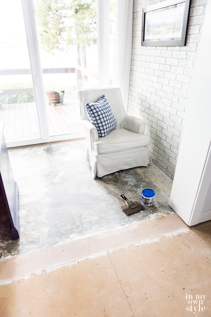 If you read my previous post about my plans for the room, you may remember me telling you that the lake side of the room was once a porch where the floor is concrete. There was about a 1/2″ level difference and a rise that we could see even when the wall-to-wall carpet was over it.