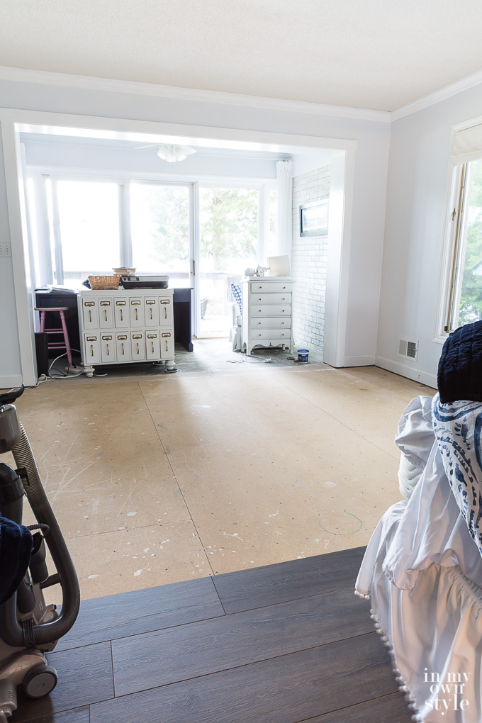 Installing hardwood isn’t quite as easy and affordable to install as wood laminate is, so as DIY’ers on a budget, laminate was our best option for the room.