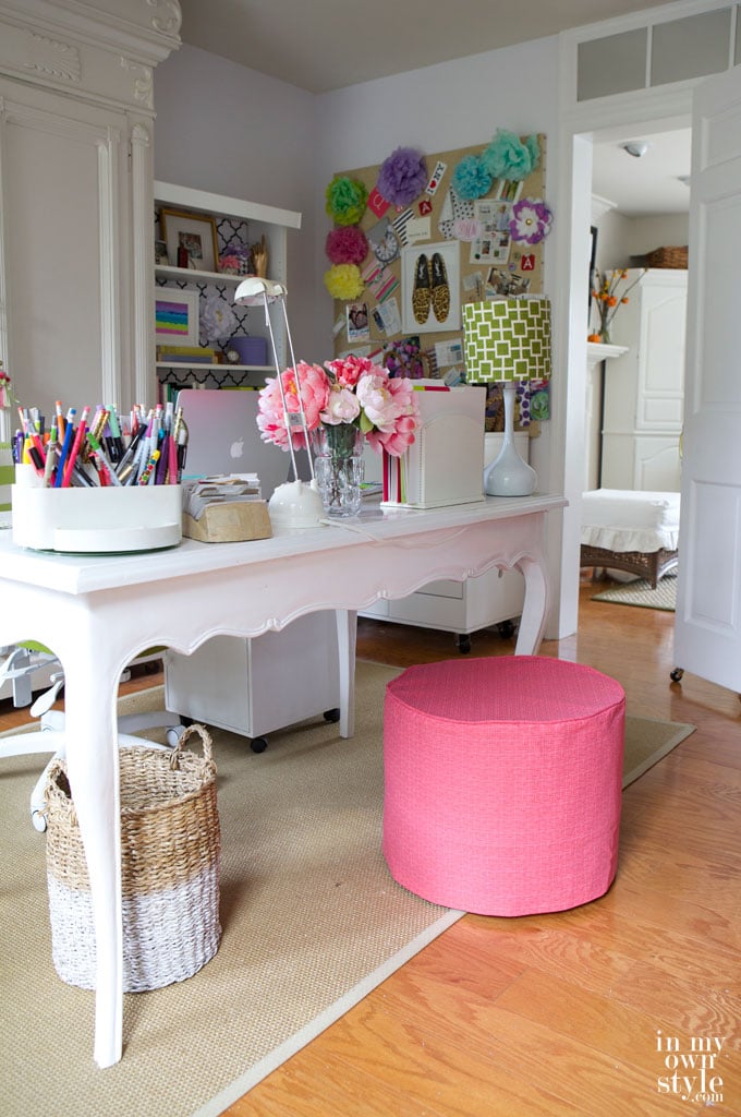 It’s making your desk blush! I love the wicker ottoman. So cute!