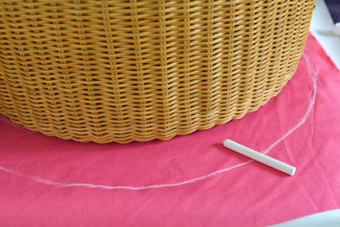 1. Lay fabric face down on work surface. Center top of ottoman on fabric and trace around it with chalk.