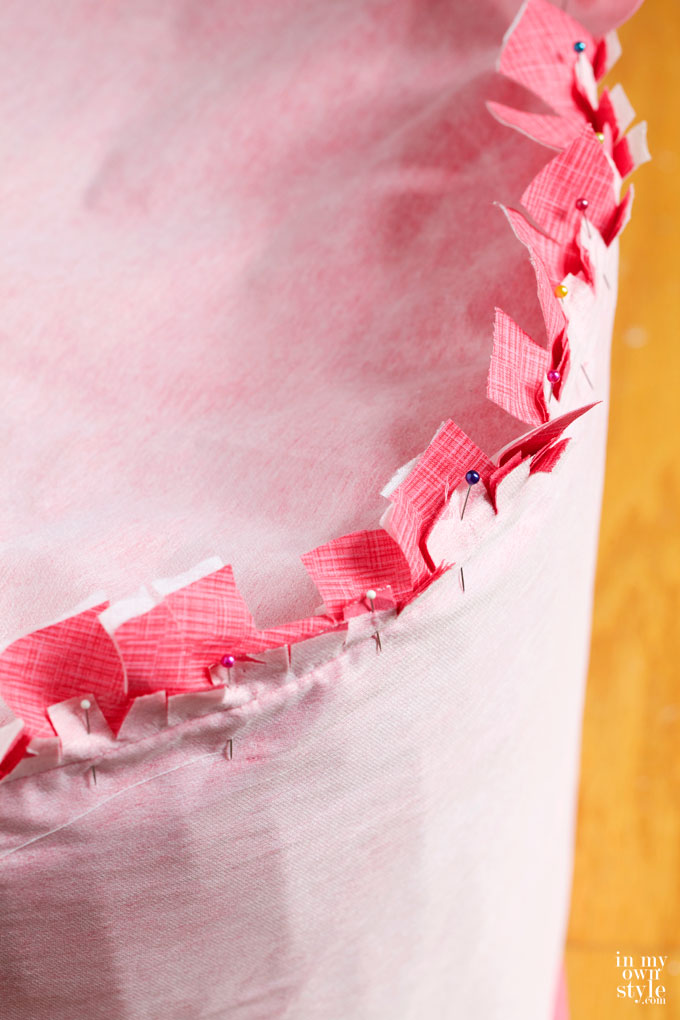 8. Notch the edge of the round piece of fabric for the top also to help curve the fabric as you pin and sew the cover together.