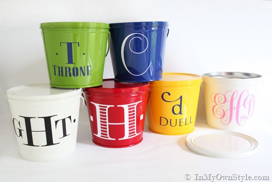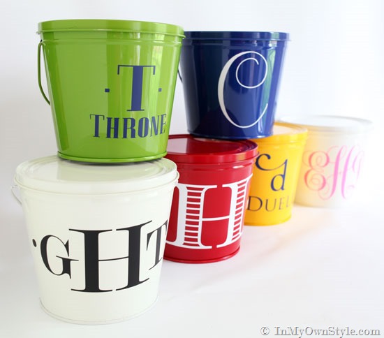 I used these fonts: From left to right: White bucket – Modern No. 20, Green bucket – Pottery Barn, Red bucket – EcuyerDAX, Blue bucket – Centeria Script, Yellow bucket – SNF Ambroisa bold and Trajan Pro (Ambrosia bold gets more flourishes for some reason when you use the Silhouette. I can’t get the “d” that way when I am using Photoshop. )