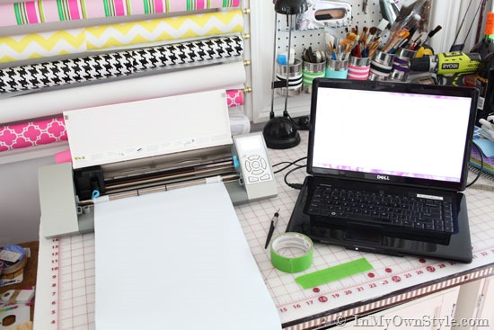 You do all the designing on your computer, and then hook up the Silhouette via a USB port as you would a printer, and then watch the magic happen. I used white, black, pink, and navy vinyl to make the initials and monograms for the candle buckets.