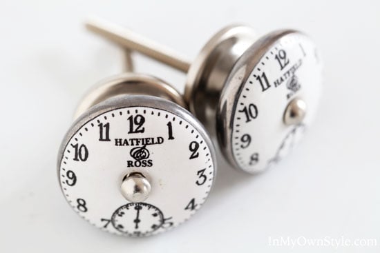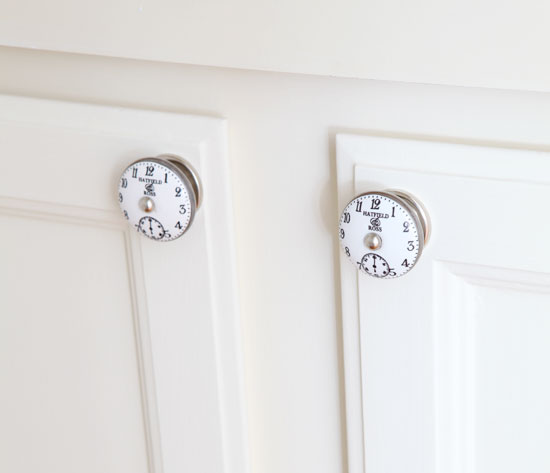 Cute knobs, Diane! I love clock faces, too. I seem to have a thing for clocks. : ) Your cabinet looks great in white. I always think it looks so fresh and clean in a bathroom.