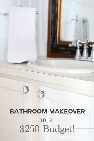 The cabinet knobs are from Anthropologie. They are called Chronograph Knobs. They sell for $8 a piece. A bit pricey for a knob, but I only needed 2 to make the sink cabinet makeover complete.