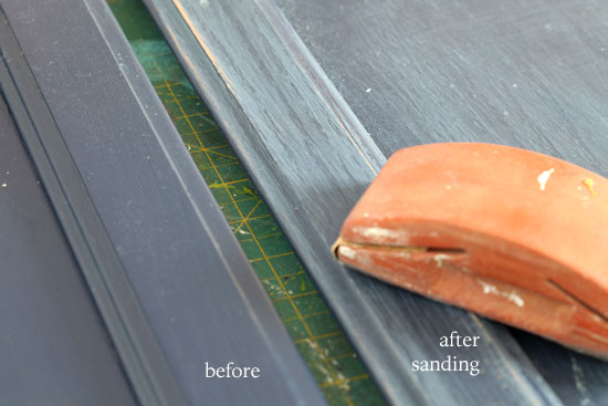 In the photo above you can see that I sanded the cabinet just enough to scratch or rough up the surface. It took 5 minutes with a hand palm sander. I then cleaned the surface well and let it dry. I sand everything I paint no matter what type of paint I use. For a little effort you will be rewarded with great adhesion.