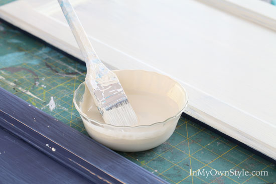 I only needed 1/2 cup of paint to make the chalk paint and paint the cabinet base – both sides of the two doors. It goes a long way.