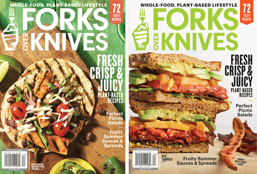 The Summer 2021 issue of the magazine is in stores now. It has two different covers. At some retailers, you might see a sandwich; in others you’ll see a grilled tostada. Either way, the interior of the magazine is the same: 100 pages of expert tips, beautiful photos, inspiring success stories, and 72 deliciously healthy summer recipes that will inspire you if you are thinking about about adding more plant-based foods to your diet.