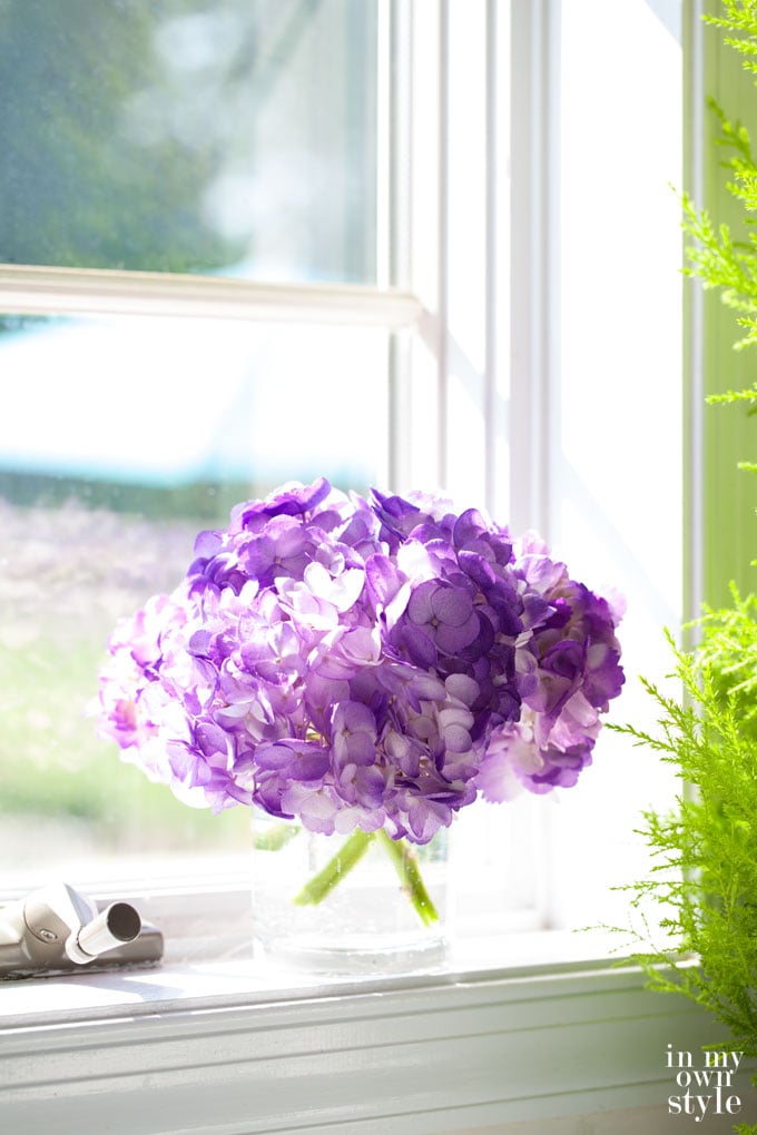 I found spray painted hydrangeas. They were white hydrangeas that were painted purple with floral misting spray paint. They reminded me of a crafty technique I used all the time back in the 90’s when dried hydrangeas were the trend.